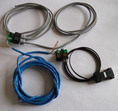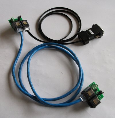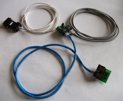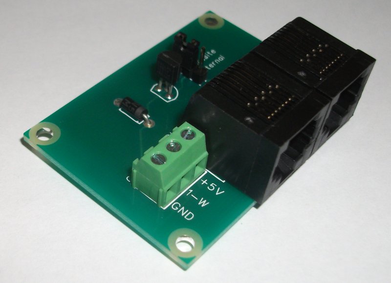 (click on any photo to see a larger version) It consists of a DS18B20 sensor mounted on a PCB together with two RJ45 sockets, a 3 way screw terminal block, a 1N5817 diode and a jumper and is available as either an assembled module, kit of parts or as a bare PCB. The PCB is 55x40mm. The RJ45 sockets overhang by around 2mm giving an overall module size of 55x42mm. The module is 20mm high. The RJ45 sockets allow you to connect the sensor inline in a network built with standard cat5 network cables without the need for any tools. They are wired to the common standard as described on our wiring information page. The screw terminals allow you to wire bare cables into the sensor if you prefer to make your connections that way. The diode is to clamp down any voltage spikes on the network that might cause unreliable readings. The jumper allows you to select the power mode for the sensor. Most people will use the parasitic power option but if you have a large network or wish to reliably read higher temperatures then you may wish to feed a seperate 5V supply to the sensor. This can be done either via the RJ45 connectors or the screw terminals. Wiring Examples Below you'll find an a few basic examples of how you might connect an SWE1 module into a 1-wire network. Click on the images for larger versions. The examples all use a DS9097U-009 serial host adapter but of course a DS9490R USB one will work just as well. These images show an old version of the SWE1 but the current one is electrically identical so can be wired in exactly the same ways. |