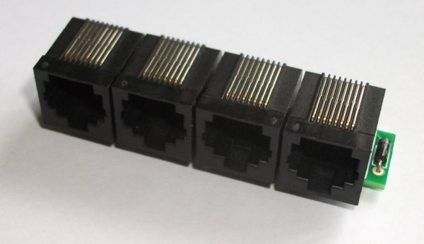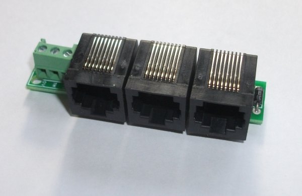 (click on the photo to see a larger version) This module is a very simple passive device with a total of four RJ45 sockets, and an IN5817 diode. Its primary use it to allow you to connect multiple SWE0 sensors so your 1-Wire network although it can also be used to connect other devices. It is optionally available with one of the RJ45 sockets replaced by screw terminals. The PCB is 68x14mm. The RJ45 sockets overhang by around 7mm giving an overall module size of 68x21mm. The module is 20mm high. In normal use two of the RJ45 sockets on PCB are used to connect the board inline to your network using standard RJ45 cables. The other two RJ45 sockets can then be used to connect 1-Wire sensors to the board, such as our SWE0 or SWE1 temperature sensors. If this is the last device on your network you have the option of connecting a third SWE0 sensor to the board as you will only be using one socket to connect to your network. The four RJ45 sockets are connected in parallel and therefore it doesn't matter which sockets you use for your network and which you use for sensors. It should be noted that this is a passive device and not an active 1-Wire hub and as such the lengths of the cables on the attached devices should ideally be less than 3m in order to ensure reliability of the network. In practice, however, you can often get away with much longer cables but this cannot be guaranteed. Please note that although this device looks very similar to our RPI3a device the two are wired differently and are therefore not interchangeable. |