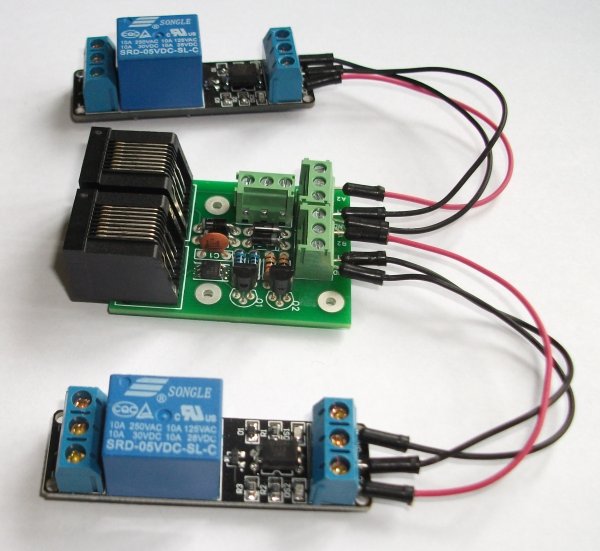 If you're wishing to use the SWE4 with the Relay Module we sell then we recommend you connect the "GND" and "IN" pins on the relay module to the GND pin on your SWE4 and the "VCC" pin on the relay module to the A2 or B2 pin on your SWE4. This will then turn the relay on when you write "1" to either PIO.A or PIO.B as above. See this image for a photo of two relay modules connected to an SWE4. |