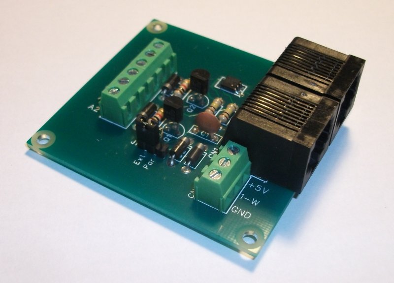 PCB with multiple RJ45 sockets to allow easy connection of several SWE0 sensors to your 1-Wire network. Also has a DS18B20 temperature sensor on the PCB.